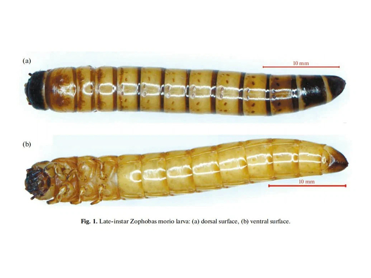Взрослая личинка Zophobas morio: (a) спинка, (b) брюшко. Длина — около 2-2,5 см. Источник НовГУ.