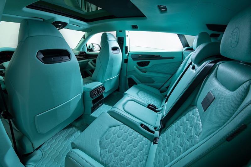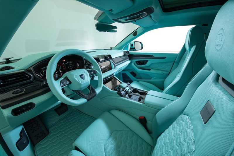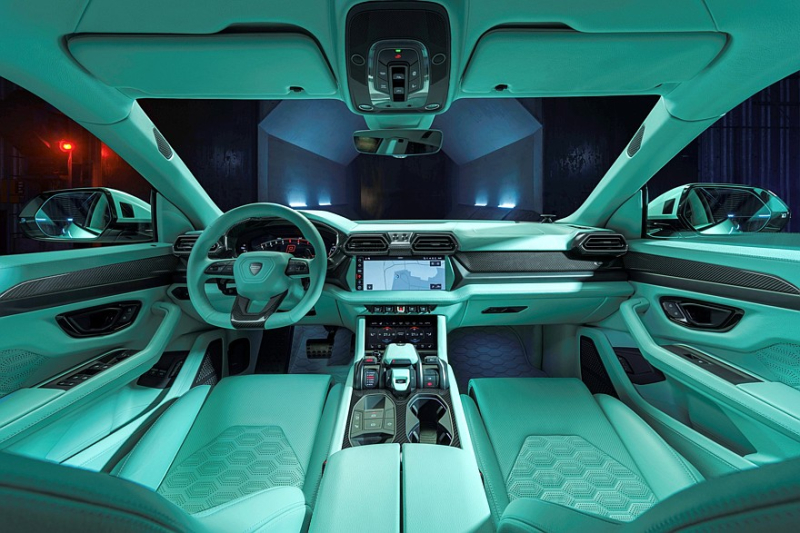 Салон, как водится у Brabus, полностью перешил нежной стёганой перфорированной кожей, её можно обнаружить в том числе на полу и в багажнике. В стоке у Lamborghini Urus SE уже немало карбоновых деталей, но Brabus добавил ещё, а педали снабжены новыми алюминиевыми накладками. В комплект поставки входят фирменная кожаная дорожная сумка от Brabus и защитный чехол для ключа от Brabus.