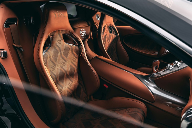 Салон тоже полностью переделан, хотя в нём сохранены основные компоновочные решения Вейрона, некоторые детали позаимствованы у моделей Chiron и Mistral. Центральная консоль стала у́же и изящнее, на её металлической поверхности разместился вертикальный ряд круглых регуляторов, а на самой вершине находятся уникальные часы с автоподзаводом, упакованные в металлический вьсьмигранный корпус. В щиток приборов добавлены настраиваемые многофункциональные экраны, но центральное место по-прежнему занимает большой стрелочный спидометр. Трёхспицевый руль новый, с металлическими сервисными клавишами и более крупными лепестками ручного переключения передач. Дверные карты тоже полностью переделаны — они, как и новые ковшеобразные сиденья, имеют комбинированную обивку из кожи и ткани ручной работы.