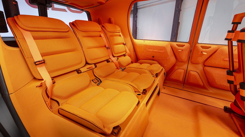 В ярко-оранжевом салоне Citroen Elo место водителя сдвинуто максимально вперёд и размещено по центру. Нижняя секция лобового стекла представляет собой большой горизонтально вытянутый проекционный щиток приборов. Руль с физическими кнопками по форме ближе к овалу. Кресло водителя во время стоянки можно развернуть лицом к пассажирам, сидящим позади, предусмотрен и обеденный столик. В багажнике имеется два надувных матраса от Decathlon, с их помощью можно организовать полноценные спальные места в салоне.