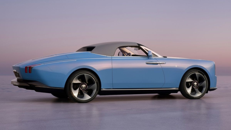 Весь нижний периметр кузова выполнен из карбона и украшен накладками из нержавеющей стали. Кузов окрашен в уникальный голубой цвет Côte d’Azur. В составе этого покрытия содержатся мельчайшие красные частицы, придающие ему легкий алый оттенок в зависимости от освещения. Крупнейшие в истории марки Rolls-Royce колеса имеют диаметр 24 дюйма, а их дизайн вдохновлен гребными винтами яхты.
