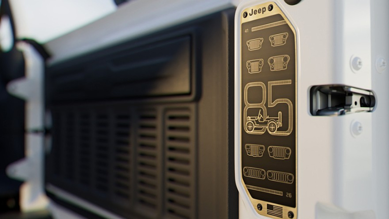 Порция изменений досталась и салону особенных версий Wrangler и Gladiator. Так, сидения отделаны тканью в серо-жёлто-белую клетку, а также имеет декор, соответствующий исполнению 85th Anniversary Edition. Ещё такая клетка предусмотрена для отделки передней панели, а руль и ряд других элементов в салоне получили контрастную жёлто-оранжевую прострочку.