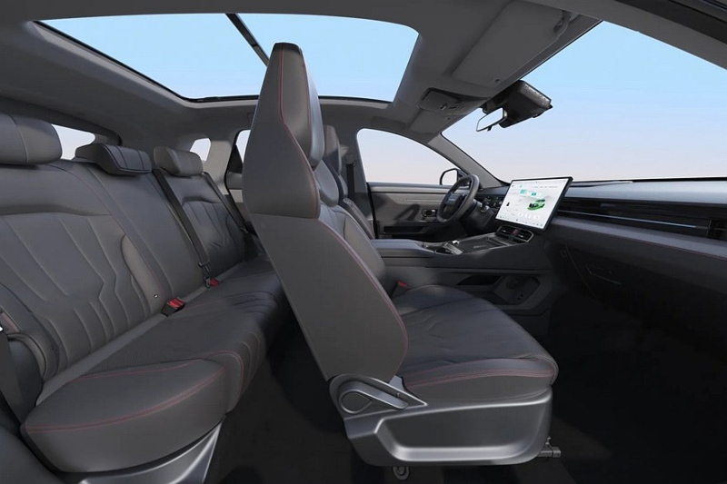 В списке оборудования переднеприводного паркетника значатся: светодиодная оптика, панорамный люк, передние и задние датчики парктроника, обогрев лобового стекла и форсунок стеклоомывателя, подогрев руля и всех кресел, вентиляция передних сидений, виртуальная приборка размером 9,2 дюйма, мультимедийная система с планшетом диагональю 12,8 дюйма, беспроводная зарядка для смартфона, кондиционер, камеры кругового обзора, круиз-контроль, системы мониторинга «слепых» зон, предупреждения о заднем поперечном столкновении и помощи при смене полосы движения.