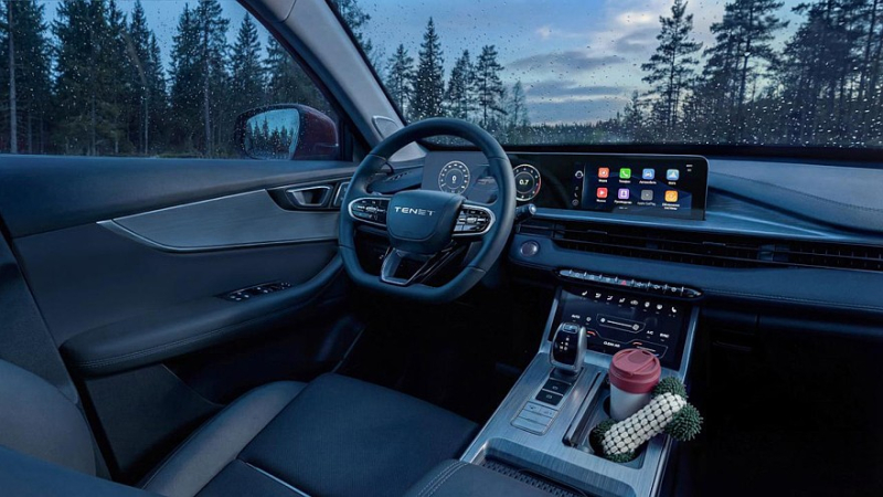 Пятиместный салон Tenet T4L отделан тёмными материалами, водительское кресло имеет электрорегулировки в шести направлениях, у переднего пассажира – механические регулировки в четырёх направлениях. На передней панели расположено табло, объединяющее в себе виртуальную приборку, и тачскрин информационно-развлекательной системы (диагональ каждого – 10,25 дюйма).