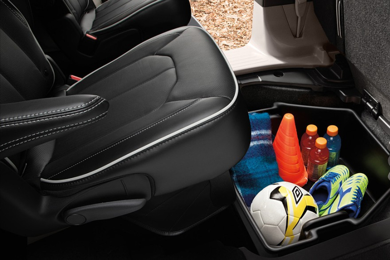 Интерьер прежний, не считая новой эмблемы на руле. Ну и для топовой версии Pinnacle теперь доступна кожаная отделка Blue Agave с медными акцентами. В салоне – аналоговые приборы и мультимедийная система с экраном диагональю 10,1 дюйма, множество физических клавиш и шайб. В списке оборудования все так же значатся встроенный пылесос и фирменная система Stow’n Go, которая позволяет сложить сиденья второго и третьего рядов в ровный пол. Минивэн бывает семи- или восьмиместным.