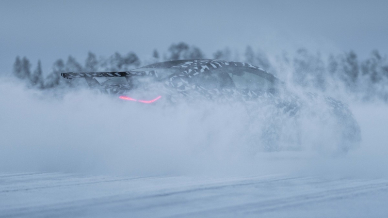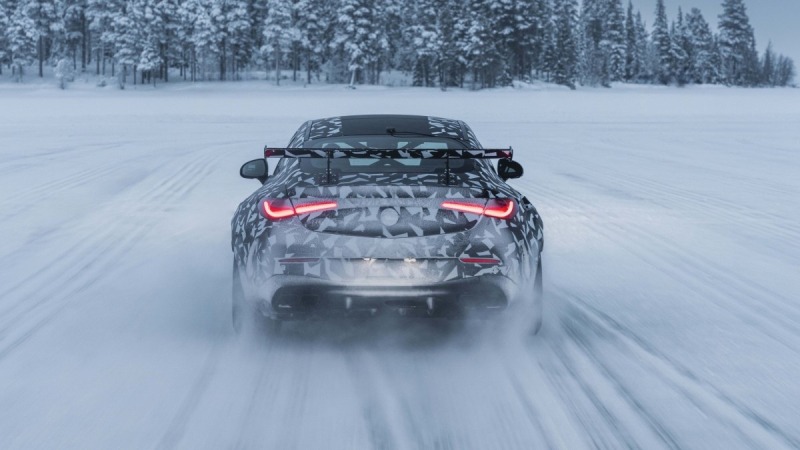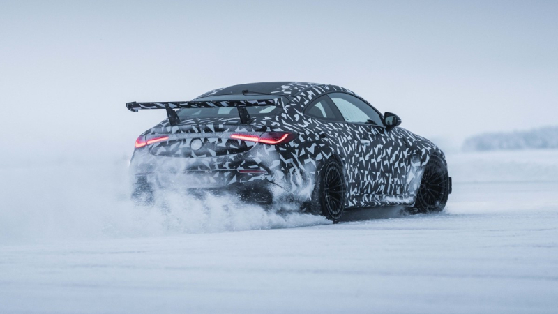 Сейчас автомобиль проходит зимние тесты на шведских дорогах близ Полярного круга: таким образом производитель намерен проверить надежность всех деталей и систем в условиях низких температур. Кроме того, производитель опубликовал фотографии грядущей новинки, но прототип запечатлен на снимках в камуфляже. Впрочем, пленка не мешает рассмотреть радиаторную решетку Panamericana, крупный воздухозаборник в переднем бампере, широкие колесные арки и внушительное заднее антикрыло взамен небольшого спойлера у купе и кабриолета Mercedes-AMG CLE 53. Наконец, четыре круглых выхлопных патрубка уступили место четырем ромбовидным раструбам.