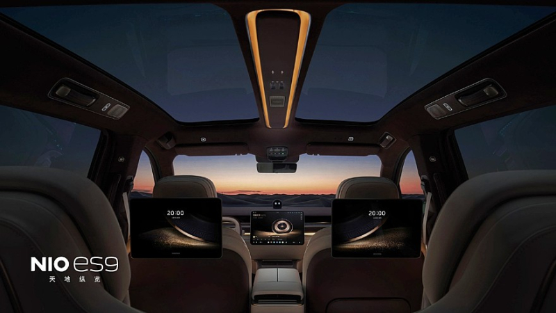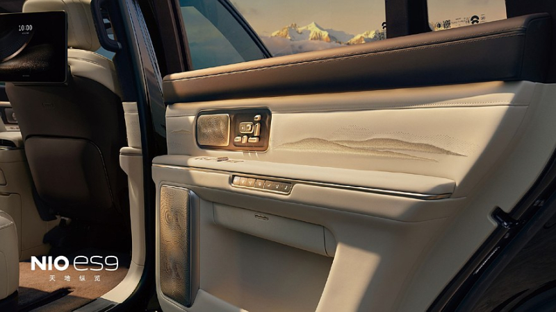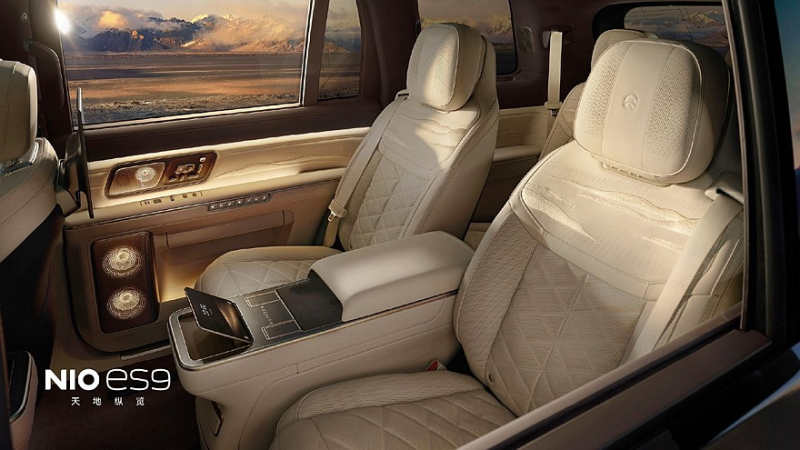 Салон Nio ES9 имеет посадочную формулу 2+2+2, главные кресла с так называемой нулевой гравитацией и кучей всяких настроек находятся во втором ряду. Никаких сюрпризов в дизайне салона нет, здесь всё примерно то же, что мы видели на других моделях Nio, только места больше, а отделка богаче. На спинках сидений и дверных картах предусмотрена художественная вышивка в виде пейзажей. Прозрачная крыша разделена на две части продольной консолью в авиационном стиле, откидного киноэкрана нет, но для пассажиров второго ряда предусмотрены индивидуальные 14,5-дюймовыми развлекательными мониторами и общий настроечный 8-дюймовый экранчик на центральном подлокотнике. Прозрачность боковых окон можно будет регулировать. В штатной аудиосистеме будет около трёх десятков динамиков.
