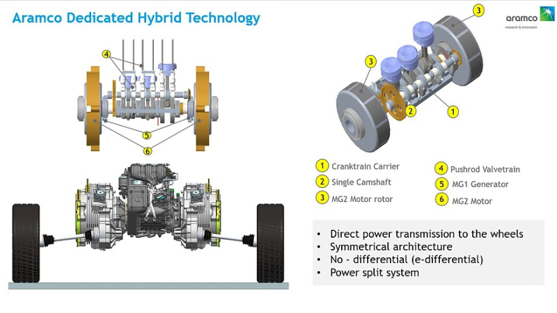 Нефтехимическая компания Aramco из Саудовской Аравии разработала силами своего американского технического центра Aramco Americas в Детройте инновационную гибридную силовую установку DHE (Dedicated Hybrid Engine) c высокоэффективным двигателем внутреннего сгорания в основе. Главные преимущества системы Aramco DHE — компактность (не нужны коробка передач и дифференциал), экономичность и малое количество деталей.