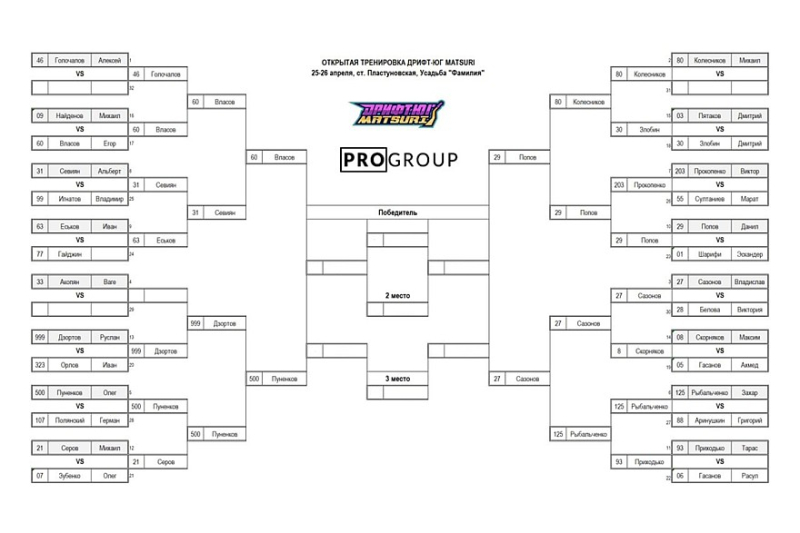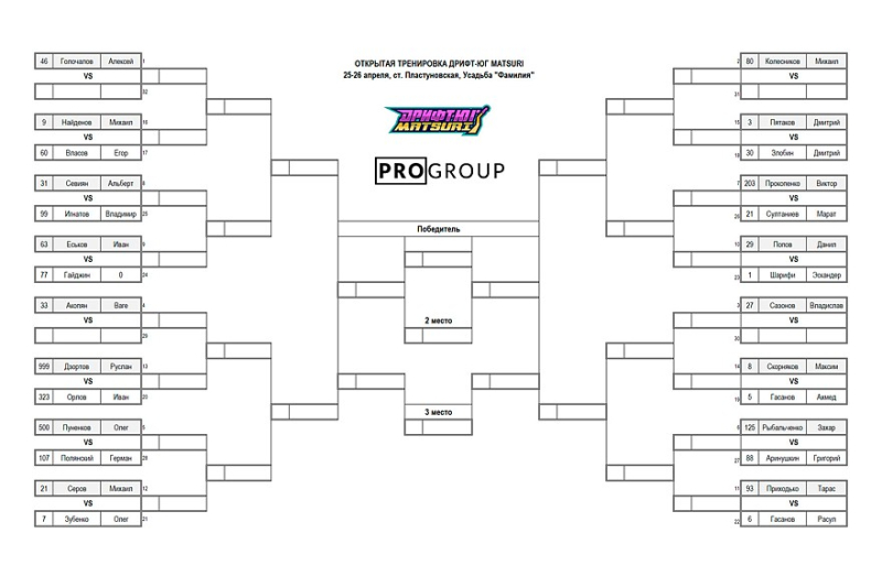 Ещё до первых парных заездов стало известно: Ваге Акопян (Майами, BMW Е46 coupe), который должен был закрывать бай-ран, утром объявил технический сход по состоянию здоровья. Впервые в истории «Дрифт-Юг Matsuri» победитель в парном заезде ТОП-32 автоматически шагнул бы в ТОП-8 – этим победителем стал Руслан Дзортов (Магас, BMW) в заезде с Иваном Орловым (Геленджик, Toyota Mark II).
