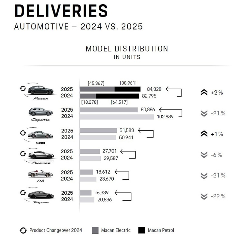О продажах Porsche в 2025 году мы подробно рассказывали в январе, здесь лишь вкратце скажем, что они сократились на 10,1% до 279 449 автомобилей. Ниже приводим наглядную инфографику продаж по моделям, взятую из опубликованной вчера презентации финансового отчёта за 2025 год.