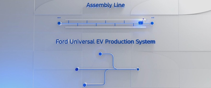 Новый производственный процесс, именуемый Ford Universal EV Production System, требует переделки всего существующего конвейера. Ford хочет разделить начальную часть линейного конвейера на три части подобно ветвям дерева: первая ветка будет собирает переднюю часть машины, третья — заднюю часть, вторая (центральная) — центральную часть с батареей, затем эти три ветки сливаются в одну и дают готовый электромобиль.