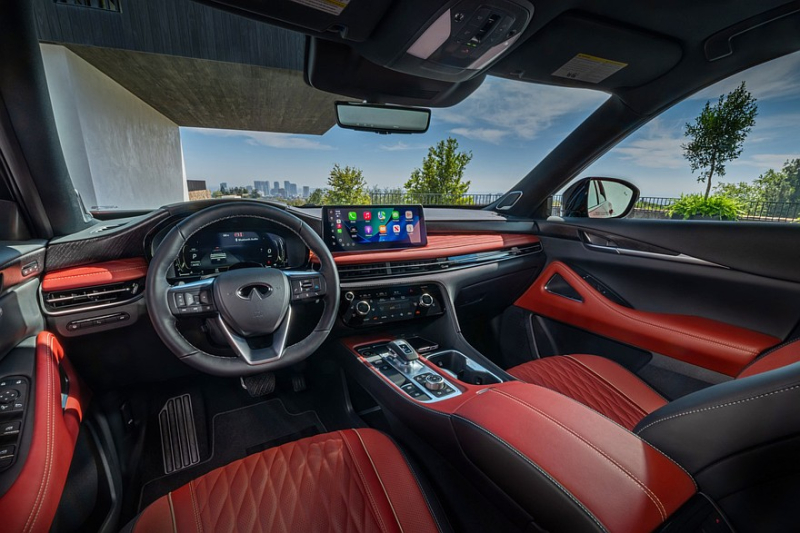 Внутри Infiniti QX65 дословно повторил брата, не считая, конечно, отсутствия третьего ряда кресел. Перед водителем установлен приборный экран диагональю 12,3 дюйма, по центру красуется планшет мультимедиа аналогичного размера.