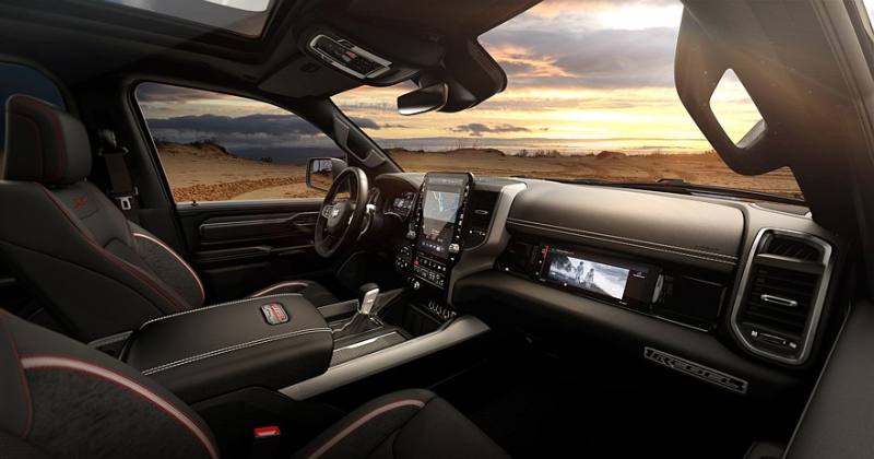 В салоне Ram 1500 Rebel X установлены кресла с подогревом, отделанные кожей и винилом с красной контрастной прострочкой (передние ещё и с вентиляцией, предусмотрены подрулевые переключатели, панорамный люк в крыше, особый декор. На передней панели два дисплея: виртуальная приборка диагональю 12,3 дюйма и тачскрин информационно-развлекательной системы на 14,5 дюйма. Доступны также устройство для беспроводной зарядки смартфонов и аудиосистема Harman Kardon с 19 динамиками.