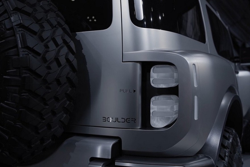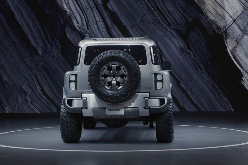 В верхней части дверей есть дополнительные окошки. Распашная багажная дверь с наружной запаской – с «двойными петлями», то есть открывается она в обе стороны. Заднее стекло можно опустить. Наконец, Boulder имеет 37-дюймовые шины. А вот размеры внедорожника компания не раскрыла.