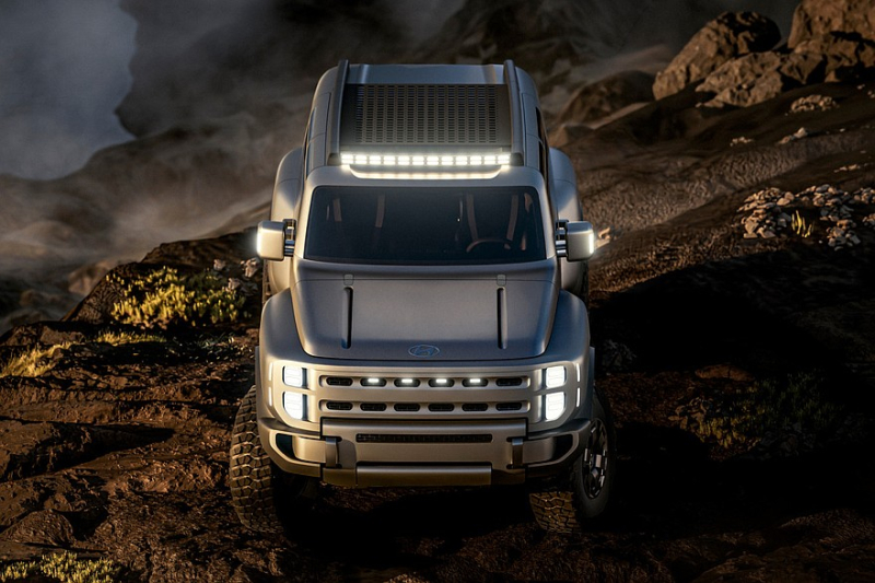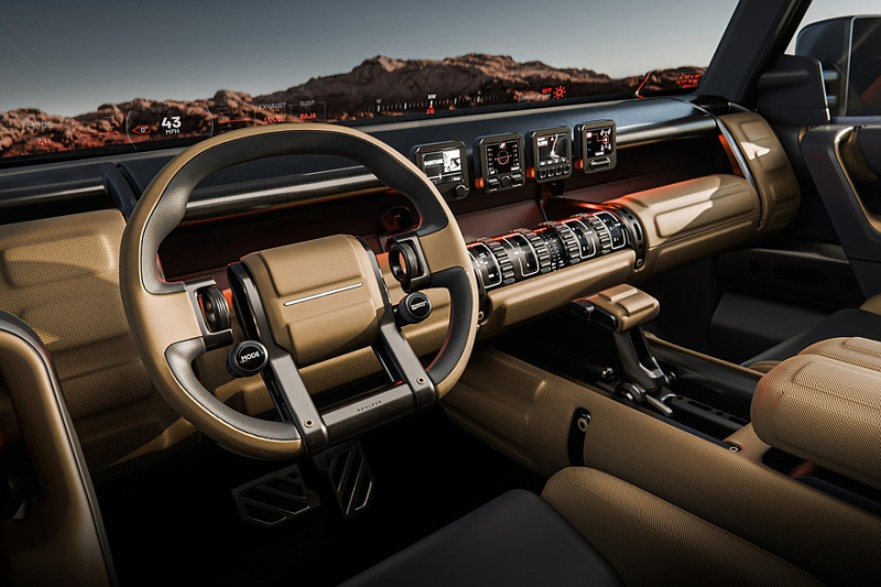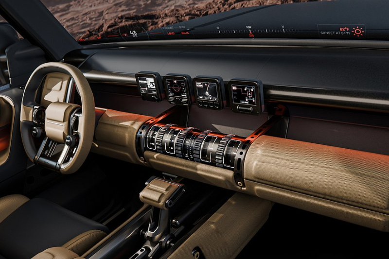 Интерьер пока продемонстрировали лишь на картинках — не живьем. Для вездехода предусмотрены проекционный дисплей во всю ширину лобового стекла, четыре небольших экрана по центру передней панели, массивный селектор коробки и множество физических клавиш. Еще обещаны «уникальные раскладные столики», но на изображениях их не видать.