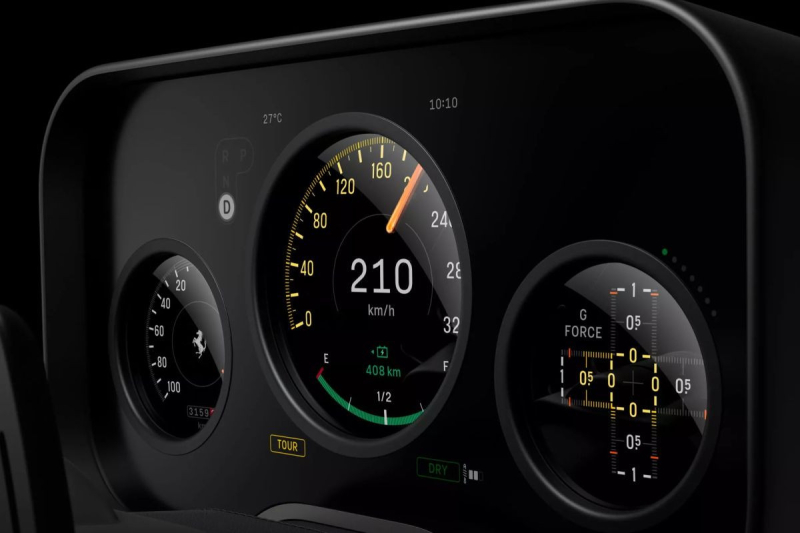 На рулевой колонке гиперкара Ferrari Luce установлена оригинальная приборная панель, созданная при помощи компании Samsung Display. В общем блоке (диагональ 12,5 дюйма) со сглаженными углами расположены три круглых дисплея, между которыми находятся дополнительные индикаторы. Примечательно, что «циферблаты» для пущей аналоговости даже обладают физическими стрелками.