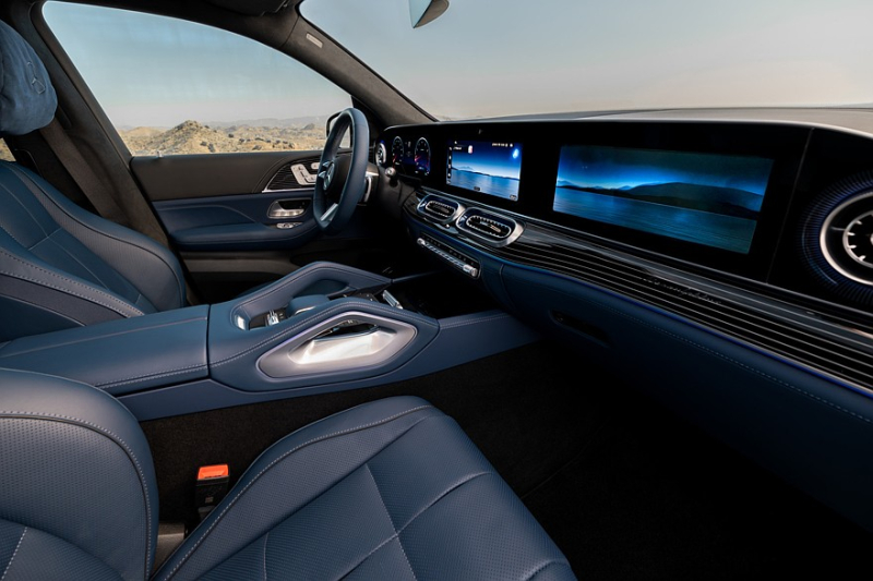 Интерьер тоже во многом повторяет посвежевший GLS, к примеру, на передней панели можно увидеть те же три дисплея диагональю 12,3 дюйма каждый. Появились другие дефлекторы вентиляции с подсветкой, иные органы управления на рулевом колесе. Предусмотрены иные материалы для отделки салона, кроме того, посвежевшему GLE доступна новая акустическая система с 15 динамиками.
