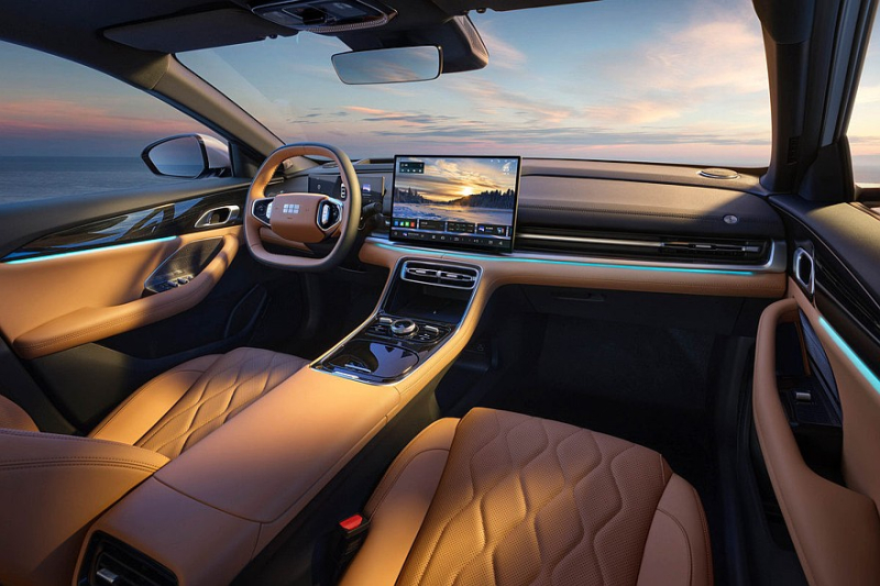 Внутри электроверсия повторила гибрид. В салоне установлены двухспицевый руль, двухэтажный центральный тоннель, раздельные экраны приборки и мультимедийной системы. Мультимедиа – на основе искусственного интеллекта. На тоннеле Galaxy A7 EV – отделка «под дерево» (для «просто» A7 такая тоже предусмотрена, плюс можно выбрать интерьер с глянцевым пластиком). Предполагается, что в список оборудования топового электроседана еще вошли аудиосистема Flyme Sound с 16 динамиками (включая динамики в подголовнике водительского кресла), панорамный люк, подогрев, вентиляция и массажер передних сидений, проекционный дисплей, камеры кругового обзора.