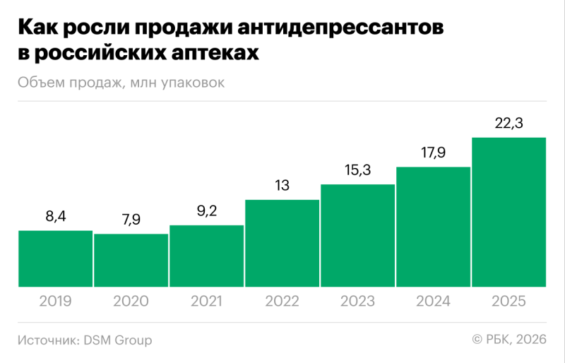 Российские аптеки по итогам 2025 года продали 22,3 млн упаковок антидепрессантов на 20,5 млрд руб., следует из данных аналитической компании DSM Group (есть у РБК). Объем продаж этих препаратов в сравнении с 2024 годом вырос на 24% в натуральном выражении и на 36% в деньгах. Это самая высокая динамика после 2022 года. В том году прирост продаж этих препаратов относительно 2021-го составил 42% в натуральном выражении, а в деньгах — 66%.