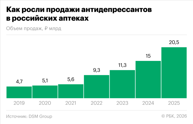 Аналитическое агентство RNC Pharma согласно с такой оценкой динамики продаж лекарств, рассказал РБК директор по развитию агентства Николай Беспалов. Но эксперт называет другие абсолютные показатели. По оценкам RNC Pharma, за 2025 год в стране было продано 23,5 млн упаковок антидепрессантов на 19,5 млрд руб. Прирост в сравнении с 2024 годом составил 35,8% в рублях и 24% в упаковках, оценил Беспалов.