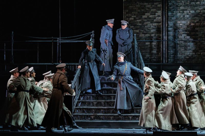 Эти сцены в двух актах решены без художественных изысков — стрельба, бегающие перепуганные юнкера, сто из которых — студенты, а винтовки они держат, как лопаты. Две сцены — бегство гетмана, переодетого в германского офицера, бросившего на произвол судьбы армию, и с петлюровцами, чинящими самосуд. Но простоту этих сцен Дубровский неожиданно завершит метафорой: юнкера в исподнем на сценическом круге. Их медленное вращение в холодно-мертвенном свете под хоральную музыку, выросшую из капели первого акта, выглядит страшно. Вспомнился Вертинский: «Я не знаю, зачем и кому это нужно. Кто послал их на смерть недрожащей рукой?…»