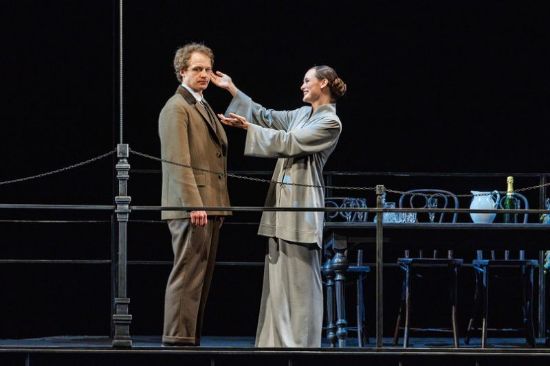 Рояль занимает левую часть этажа, и его чернота сливается с чернотой сценического пространства. Елена Тальберг в длинном чёрном платье извлекает из клавиш странную музыку, похожую то ли на капель ранней весны, то ли на утекающее время — по капле. Негромкая, с паузами, и надежда на обновление в ней слышна, и тревожное что-то одновременно. Композитор Александр Чайковский (это его второй спектакль в Малом) удивительным образом разработает тему дальше.