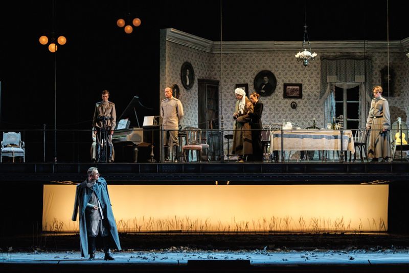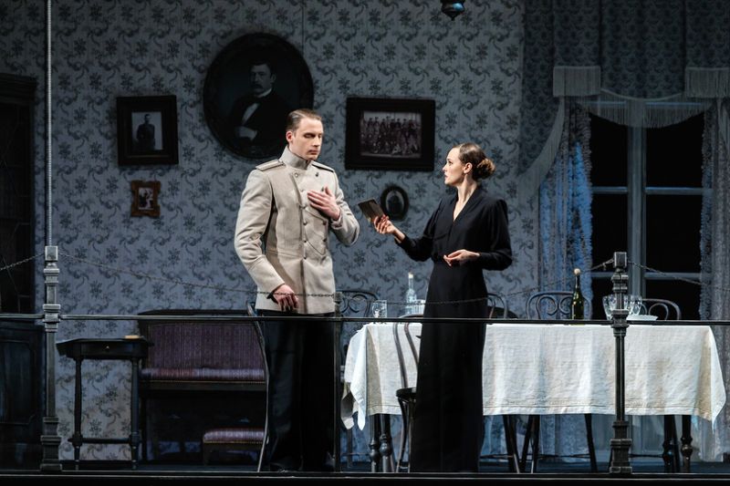 Впрочем, премьерная постановка главрежа Малого театра Алексея Дубровского не имеет откровенно политического характера. Напротив, с начала первого акта визуально явлена красота и мощь сценографии, которая к тому же тонко озвучена музыкально. Киев 1918-1919 годов, где развиваются полные драматизма события, художник Максим Обрезков разместил на двух уровнях, и мать городов русских занимает все пространство исторической сцены по горизонтали и вертикали. На верхнем этаже — частная жизнь героев Булгакова. Справа — домашний уют: строгие обои, фотографии в рамочках, три люстры с теплым желтым светом, стол под белой скатертью, накрытый в ожидании гостей. Символ уюта — кремовые шторы, о которых часто тут говорят.