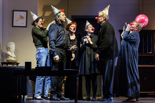 Серебряков преподает в университете, организовал кинофестиваль, на который не выделили финансирование, и дело его жизни терпит крах. Он рассуждает со сцены о румынской «новой волне», а во втором действии прочитает лекцию у экрана, на котором царит лютый Апокалипсис, появляются Тильда Суинтон, Адам Драйвер, Билл Мюррей и другие звезды в фильме «Мертвые не умирают» Джармуша. Это уже перебор.