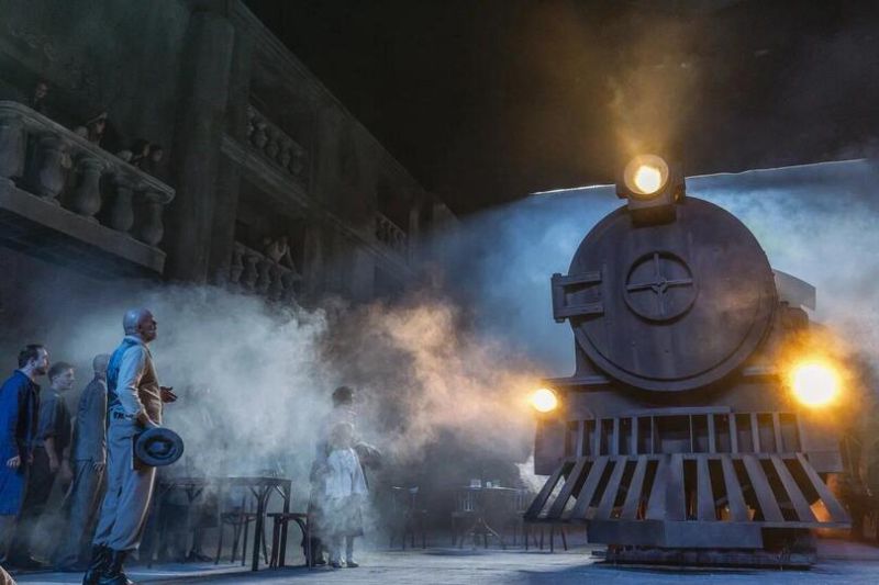 И вдруг среди этого возникает почти нереальная деталь: на сцену по настоящим рельсам выезжает самый настоящий паровоз старых времён с прицепленным к нему вагоном. Тяжёлый, неумолимый, как ход времени, который уже невозможно остановить. Он — мощь и осознание невозможности на него повлиять, с ним договориться, изменить движение этой железной махины. Он — символ того, что в скором времени развернётся на сцене.