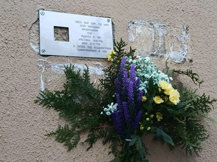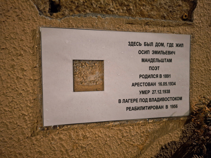 Временная версия таблички «Последнего адреса» Осипа Мандельштама в Москве