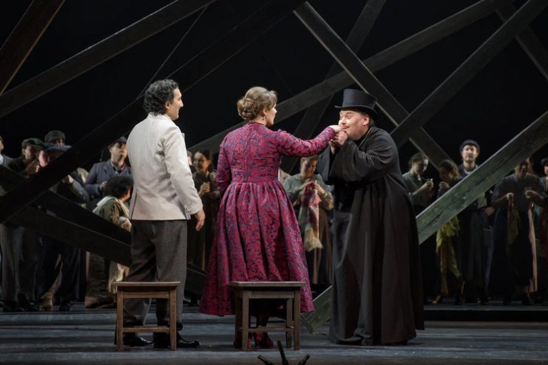 Смелое решение предлагают авторы спектакля для создания образа Священника (Максим Осокин). Православный поп представлен в этой опере ровно так, как это было принято в искусстве атеистического советского времени, — гротескно и сатирически. Впрочем, надо быть честными и признать: русские писатели и художники тоже весьма критично относились к представителям духовного сословия, достаточно вспомнить картины передвижников, да и тексты самого Лескова. В «Леди Макбет» священник весьма игриво ведет себя, находясь у смертного ложа Бориса Тимофеевича, а затем, в состоянии сильного алкогольного опьянения, поет славу убийцам Катерине и Сергею на их свадьбе. В спектакле Тителя поп появляется на сцене в рясе с крестом на груди, но… в цилиндре. Так что поп это или кабаретный черт — сам черт не разберет.
