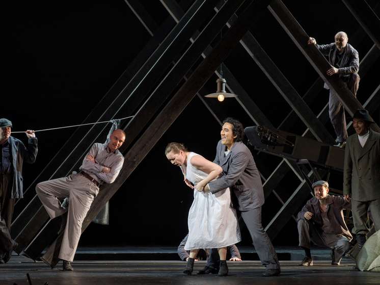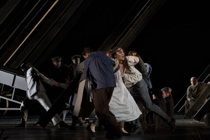 По этой ли причине или по какой-либо другой Титель и Леднёв избрали первый вариант — не столь важно. Но именно он был представлен на сцене МАМТа в весьма убедительном решении. Создатели спектакля поставили его так, если бы премьеру в 1934 году в Театре имени Немировича-Данченко поставил не Немирович-Данченко, как это и было на самом деле, а Всеволод Мейерхольд. Мрачная черно-серая картинка. Пританцовывающая группа неприметных рабочих, как будто выпрыгнувших из монохромного советского фильма 30-х годов, мелкими бесами снует по сцене и формирует пространство. А пространство совсем не веселое: огромные балки, поддерживаемые канатами, принимают разные формы — от гигантских противотанковых ежей до вертикальных условных сосен лесоповала. Никакого быта, никакого уюта. Даже кровать, где совокупляются Катерина и Сергей, не обладает эротической притягательностью. Здесь вообще нет покоя. Нет красоты, нежности. Сплошная физиология, цинизм, грубость. Рискованно — да. Но так написано у авторов. Такова опера ХХ века. За это мы ее и любим. Или не любим.