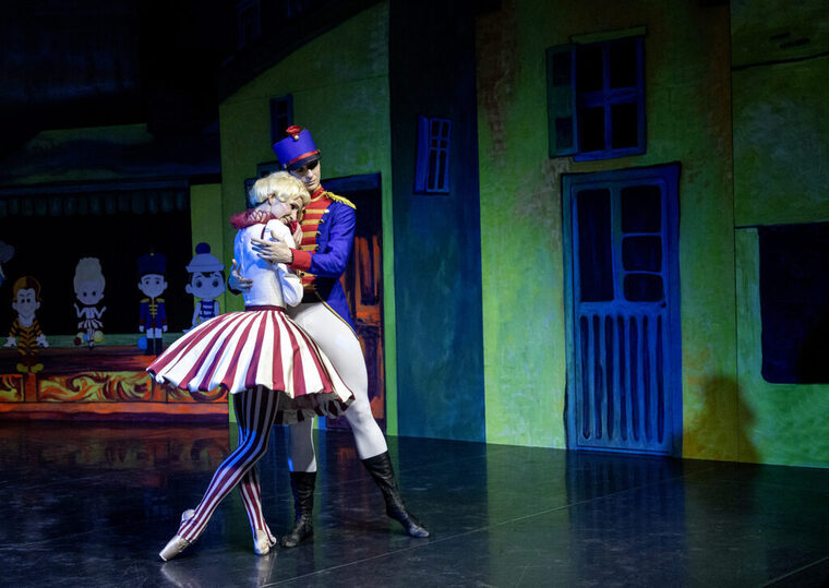 Действие начинается в красочном ящике с игрушками, в который художник Екатерина Агений превратила всю сцену за исключением зоны оркестра. Оркестр тоже расположен прямо на сцене перед зрителями с левой стороны. Тут с самого начала находится, например, подвешенный вместе с облаками над сценой домик-ферма, который впоследствии покупают на свои игрушечные сбережения Солдатик и Кукла и воспитывают там родившихся у них трех детей. На загляденье маленьких зрителей находится на сцене и трактор, и Магазин игрушек, в котором, собственно, по либретто и начинается действие балета.