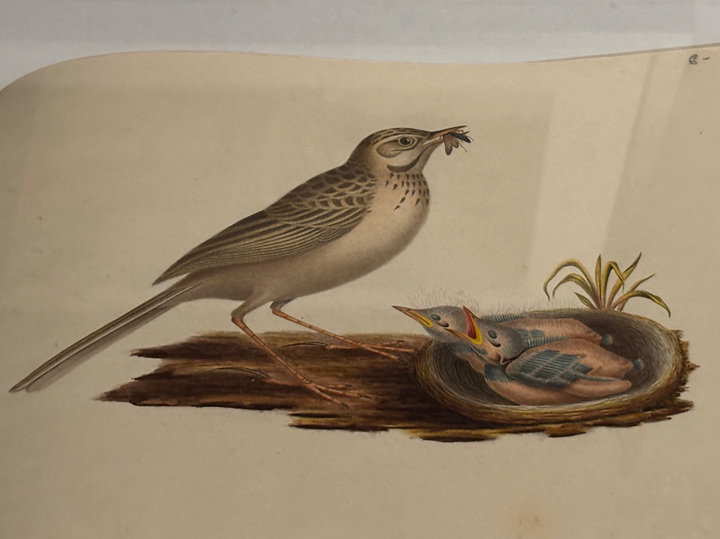 Если вспомнить, как о декабристах рассказывают в школе, то все ограничивается самим восстанием и дальнейшей казнью пяти человек. Да коротким комментарием о том, что остальных отправили в ссылку, но что там было со ссыльными, приходится узнавать «внеклассно». На выставке акцент делают на устройстве их быта и тут же иллюстрируют рисунками самих декабристов — как жили люди в ссылке, чем занимались. Например, когда в 1830 году декабристов переводили в Петровский завод, то идти туда пришлось пешком, ночевать — в юртах, охраняли их бурятские всадники, на стоянках «гуляли и любовались местоположением». С особым вниманием относились к природе, которая впечатляла ссыльных — собирали гербарии и коллекции насекомых. Отсюда — альбомы с изображением природы, на верхней крышке одного из таких надпись «ПТИЧКИ», он хранит в себе множество рисунков с изображением птичьей жизни, трогательный сюжет удалось застать нам — кормление птенцов, у мамы-птички в клювике жучок, а малыши раскрыли желтые ротики в ожидании еды.