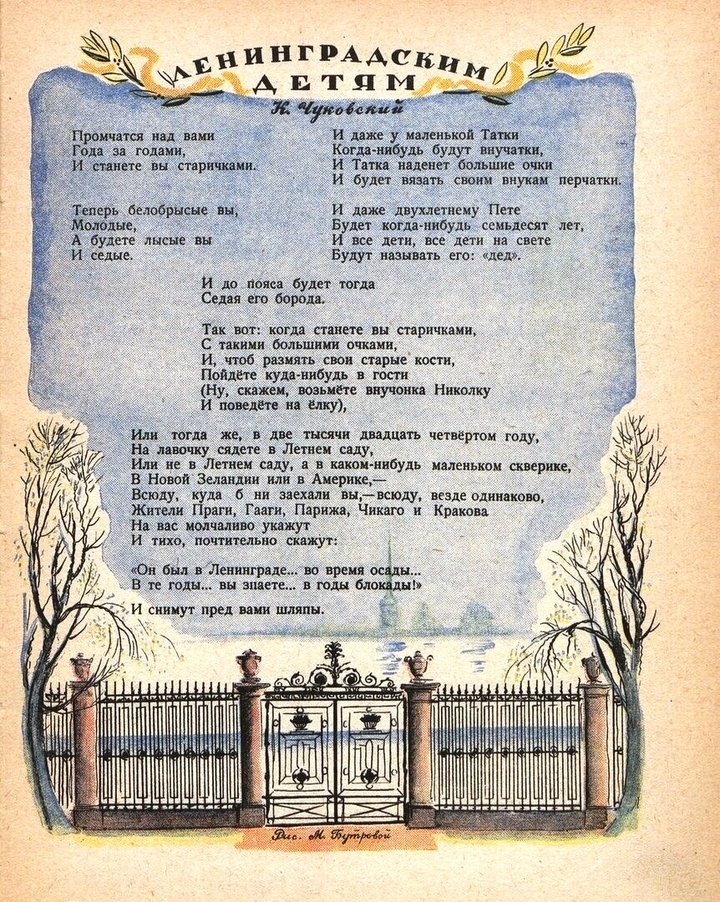 Перепечатанное в 1945-м году «Мурзилкой» стихотворение получило художественное оформление, например, было снабжено картинкой — рисунком исторической решетки Летнего сада, а на заднем плане из тумана возникал силуэт Петропавловской крепости. Обе публикации — газетная и журнальная — несомненно заслуживают того, чтобы остаться в вечности, хотя на самом деле в ней остаются тексты, а не типографские оттиски на бумаге.