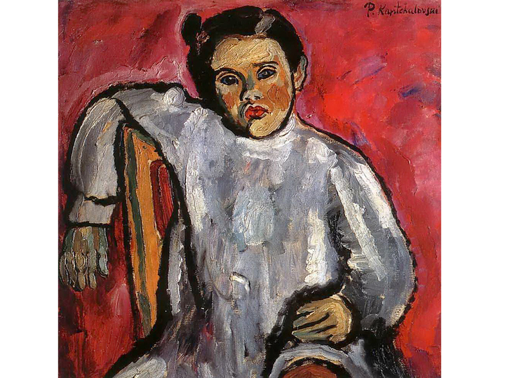 Будущая мать Никиты Михалкова Наталья — героиня портрета «Наташа на стуле». Вообще, если посмотреть на творчество Петра Петровича «сверху», то легко увидеть, что художник делал средствами живописи примерно то же самое, что и его внук средствами кино — документировал историю семьи. И общие семейные автопортреты, и себя с женой, дочь Наталью и сына Мишу, своих братьев и внуков Петр Петрович зафиксировал кистью на холсте. Кстати, возвращаясь к вышесказанному, «Наташа на стуле» — еще один пример «дикого» периода. Активный красный фон — пройти мимо девчушки с хвостиком на бочок невозможно. Она сидит на стуле и скучающе глядит на нас, но интересно и другое: какими цветами мастер создает ее личико — ярко-красные губы не выглядят странными и чужеродными (из-за фона!), а вполне естественно смотрятся на охристом лице с рыжими щеками. Грубыми зелеными мазками выписана детская ручка, скучающе повисшая на стуле, но в зеленце нет болезненности, в ней — очаровательная детская пухлость.