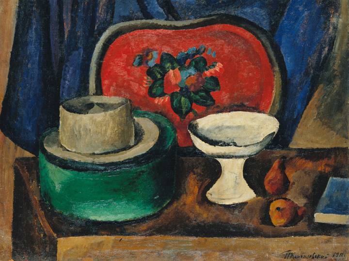 Вспомнить того же Машкова, коллегу Петра Петровича по «бубнововалетному» цеху, который не чуждался китча, изображенные в его натюрмортах рядом и изящные фарфоровые фигурки, и огурец современный зритель воспримет скорее спокойно, а зритель начала прошлого столетия закатит глаза и охнет (хорошо, если не плюнет в холст). Кстати, от радикальной вещественности пошел и излюбленный жанр группировки — натюрморт, к которому тяготел и Кончаловский. Хороший пример — «Натюрморт. Поднос и зеленая картонка», главный герой которого, яркий расписной поднос, на заднем плане, но от этого он не перестал быть смысловым центром. А рядом — картонная коробка, на которой лежит шляпа, рядом — ваза и разбросанные по столу фрукты. Переднего и заднего плана словно нет, и все, что попало на холст, одинаково важно.