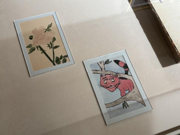 Наконец, милейшая деталь, ставшая потрясающим украшением выставки, особенно учитывая новогодние праздники, — почтовые открытки, собственноручно нарисованные княжнами Анастасией («Кот на дереве») и Марии («Цветок шиповника»). Трогательная часть выставки — элементы детской комнаты, не все экспонаты на самом деле принадлежали семье Романовых, однако дают представление о том, как выглядела их игровая. Одна только крохотная кукольная посудка вызывает умиление — кастрюльки, тарелочки с игрушечной едой на них (пирог, индейка, паштет, салат, селедка, сыр…), даже плита для них, тоже игрушечная, маленькая и очень милая.