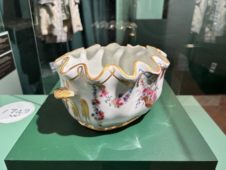 Привычная нам посуда, фарфор, который мы по сей день любим и ценим, были частью увлечений Елизаветы Петровны — именно при ней началось производство русского фарфора, прежде были восточные экземпляры. Тот фарфор, что представлен на выставке, нестандарный, чашка с блюдцем 1750-х годов внешне украшен росписью, а внутри — черные точки, признак фарфора низкого качества, брак, но другого фарфора в те времена делать не умели, и в этом, надо сказать, есть своя прелесть. Здесь же, кстати, еще один маркер елизаветинской эпохи и роскошной жизни — фарфоровая рюмочная передача, которая выглядит как ажурная ваза, салатница. В проемы вставлялись рюмки, а вниз клали колотый лед — то вам не обычное ведерко со льдом для шампанского, а вещь изысканная.