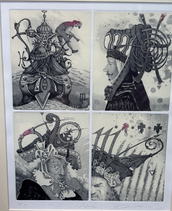 По принципу «сплошного джаза», например, раскрывается тема знаков Зодиака в четырех офортах из цикла. И здесь, как говорится, все дело в шляпе — у каждого героя свой головной убор, в котором и заложена вся суть изображаемого. Хотя и это лишь догадка.