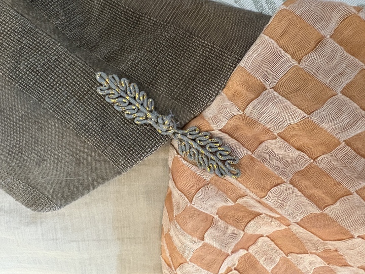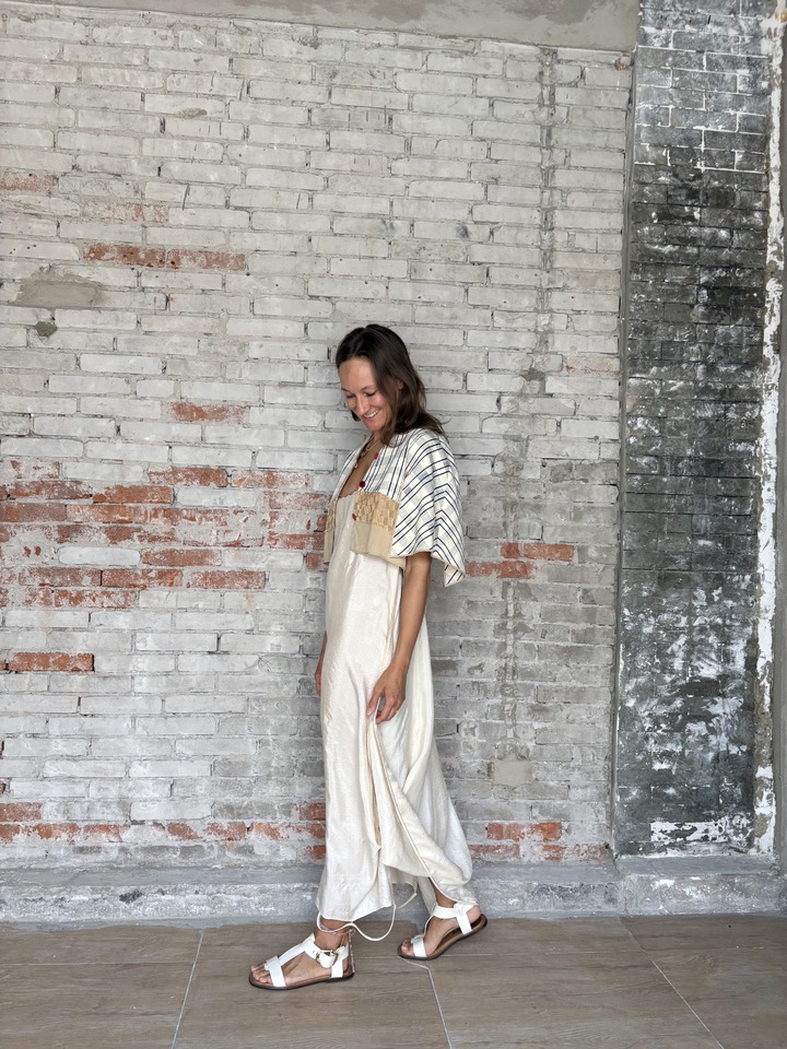 В небольшом помещении на трёх стойках с вешалками — вещи из ткани, название которых я точно не знаю. А это шёлк. Но не блестяще-струящийся, легкий с яркой расцветкой, к которым мы привыкли, а матовые, спокойных пастельных тонов, фактурные и на вид не так уж легки. Это самый что ни на есть натуральный шёлк, не тронутый никакой термической или химической обработкой. Его хозяйка — Ян Шень, молодая, улыбчивая, наливает нам с Алиной Фроленко (она помогает мне с переводом) зелёный чай, рассказывает о себе.