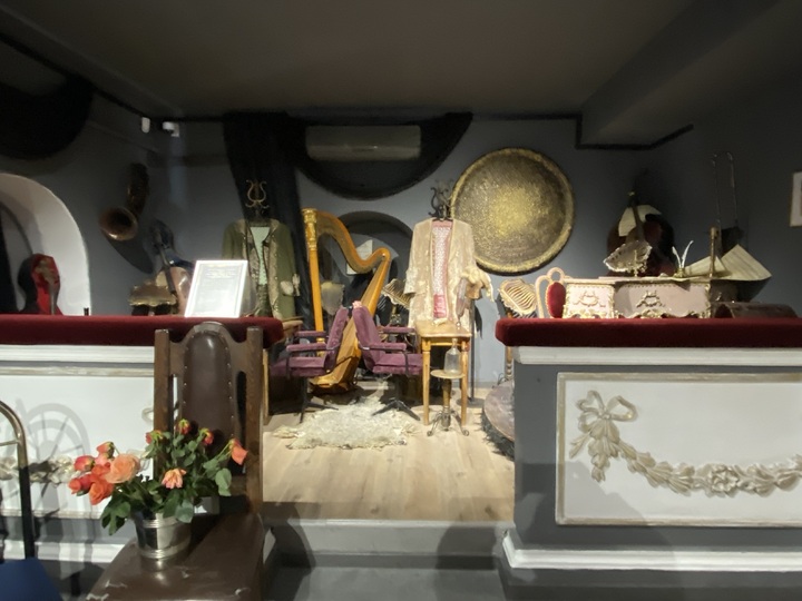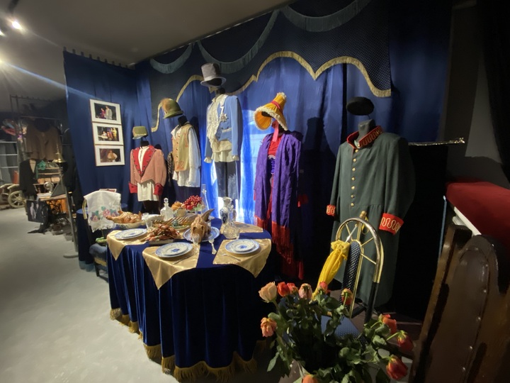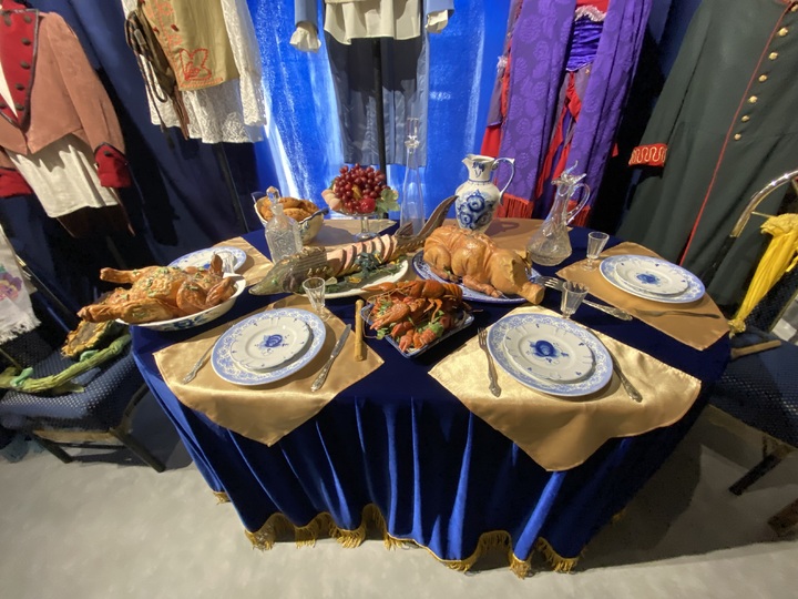 Теперь в зале, где стояли столы, за которыми сидели великие и невеликие артисты, режиссеры, художники, да и все те, кто служил театру, расположились зоны с костюмами и реквизитом из пяти знаковых спектаклей Камерного театра. «Моцарт и Сальери» справа на невысокой эстрадке, напротив входа стол с яствами из спектакля «Завтрак у предводителя». Стол здесь ломится от блюд с поросятами, индюшками, разносолами всякими — идеальная бутафория, которую умеют делать только в Ярославском театре кукол.