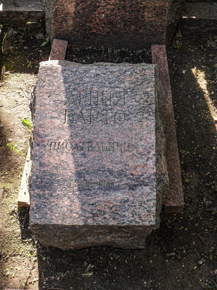 И что самое удивительное. Крупный юбилей. А в Москве существует лишь небольшой, действующий в школьной библиотеке, музей Агнии Барто. И если вам придет в голову мысль отнести цветы к одному из мест столицы, связанных с Агнией Львовной, то окажется, что нужно или ехать к Дому писателей в Лаврушинском переулке, где, впрочем, нет отдельной таблички, сообщающей, что она там жила, а лишь «коллективная». Или добираться на Новодевичье кладбище, чтобы оставить букет возле скромного по масштабам надгробия, на котором начертано: Агния Барто. Писательница. 1906 – 1981. Никаких венков, пегасов, муз, перьев, раскрытых книг и прочей заупокойной пошлости.