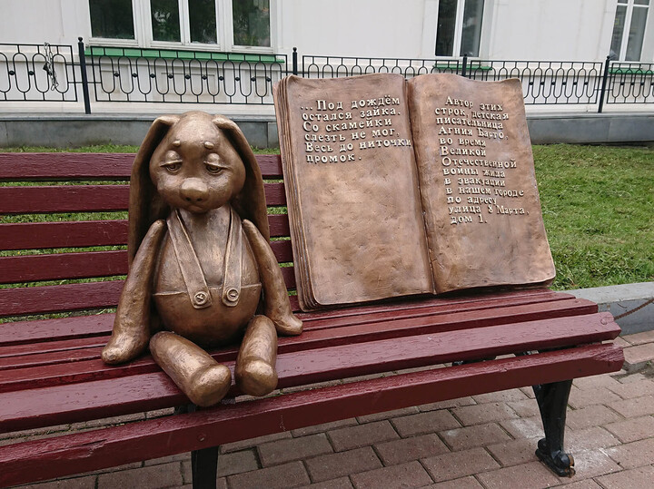 Есть ли памятник Барто в России? Есть, но это «памятник Шредингера», потому что установленная в Екатеринбурге скульптура изображает грустного зайку. Рядом на табличке – цитата с отсеченной первой строкой: