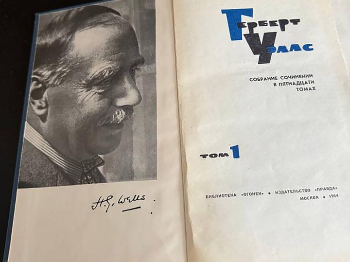 «Этот английский писатель-фантаст-провидец встречался и с Лениным, и в 1934-м году со Сталиным. Сталин пригласил его поучаствовать в съезде Союза советских писателей», — написал Мединский в официальном Телеграм. Также глава СПР поделился фотографией классического советского 15-томника Герберта Уэллса и партиздатовской брошюры «Беседа с английским писателем Г.Д. Уэллсом», вышедшей за авторством вождя и с его портретом на обложке.