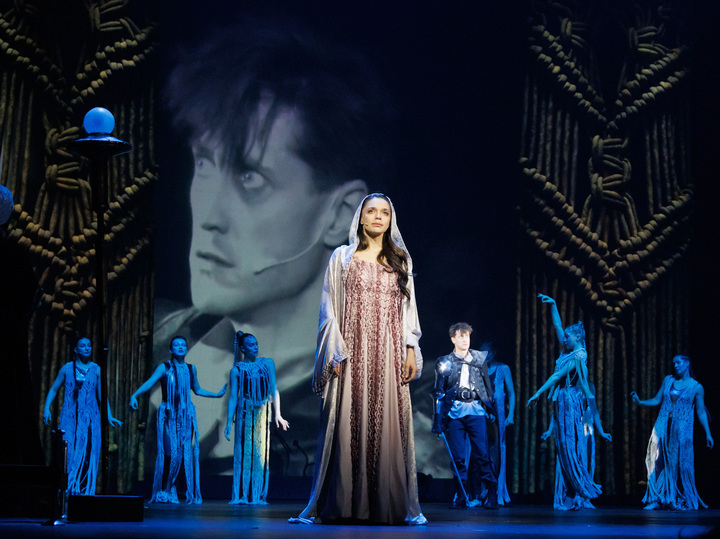 Просперо вызывает бурю, и эта сцена, решенная театрально-кинематографическими средствами, завораживает. Масштаб полотна и тщательность в проработке деталей идут здесь рука об руку. За темным тюлем в глубине сцены в пластическом рисунке (хореограф Елена Соболева-Пугачева) мечутся моряки, оказавшиеся в плену разгулявшейся стихии — сплетенье рук и корабельных канатов, падающие, бьющиеся о видео волны тела. На самом же тюле, который работает экраном, крупным планом в режиме онлайн выведены лица, глаза, полные отчаяния, рты, разрываемые криком, что заглушает рев волн. Оператор с камерой движется среди моряков по определенной траектории, и камера фиксирует эмоцию борьбы за выживание.