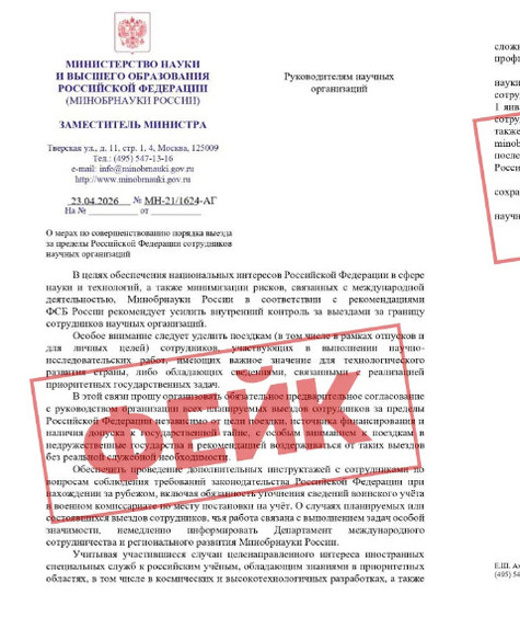 В письме, якобы присланном из Минобрнауки РФ, с улицы Тверской,11 стр.1, «О мерах по совершенствованию порядка выезда за пределы РФ сотрудников научных организаций» говорилось о том, что в связи с необходимость минимизации рисков, связанных с международной деятельностью, надо «уделить особое внимание поездкам за рубеж сотрудников, выполняющих научно-исследовательские работы, имеющие важное значение для технологического развития страны, либо обладающих специальностями, связанными с реализацией приоритетных государственных задач».