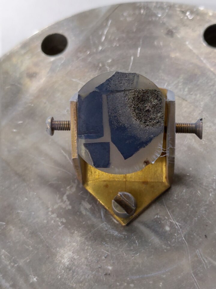 Мишень из кристаллического базальта после лазерного «удара» (виден кратер от такого удара). Автор фото Е. Сорокин