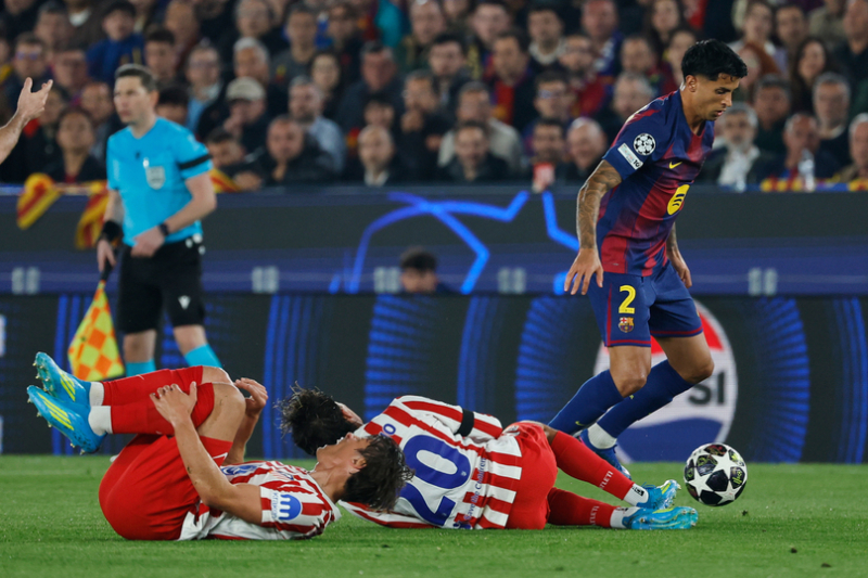 Защитник «Барсы» Пау Кубарси наносит травму игроку «Атлетико» Cимеоне / фото: AP