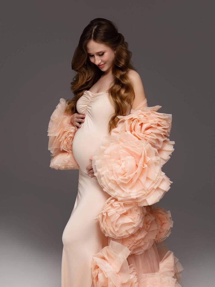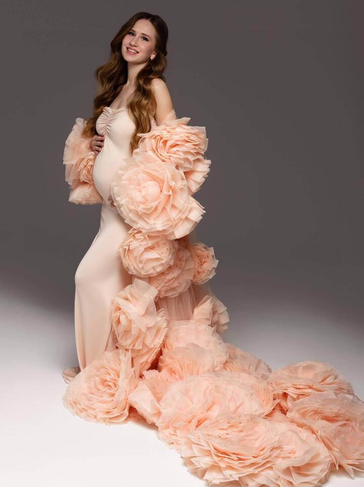 Спортсменка выбрала для съемки романтичное и нежное розовое макси-платье, поверх которого надела воздушную накидку из пышных воланов. Юлия уложила волосы красивыми волнами и сделала аккуратный макияж. Она позировала стоя и сидя на коленях.